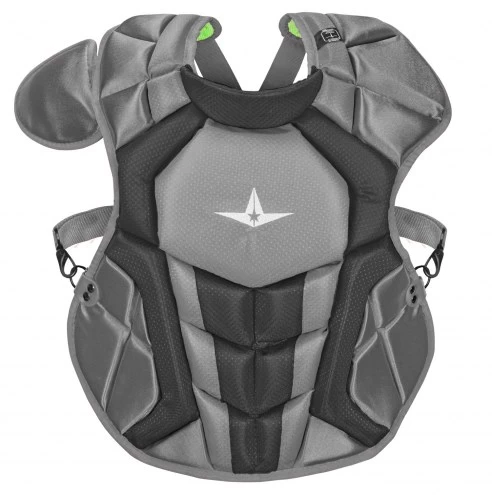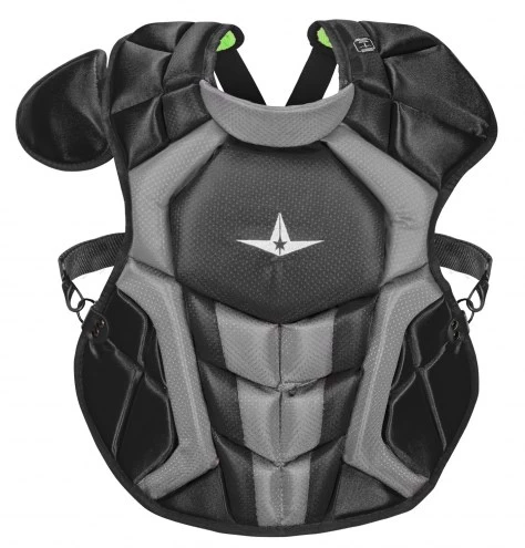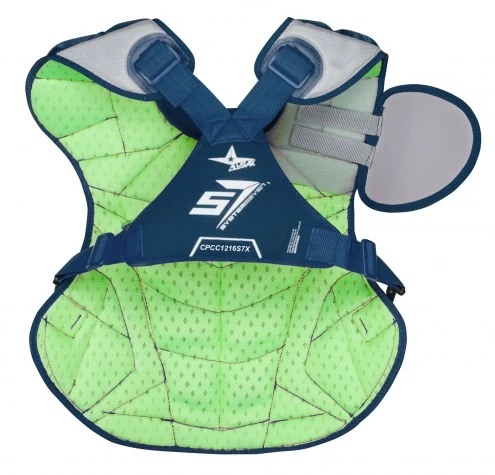 The All Star System7 Axis NOCSAE Certified Youth Baseball Catcher’s Chest Protector – Ages 9 – 12 has all the technology and features of past S7 Axis chest protectors plus enhanced protection in +the upper chest area to meet the new NOCSAE standard. Improved break points present a flatter surface for blocking, improving control. A thinner and more form fitting DeltaFlex harness offers better comfort. Diamond vents line the back for even more weight reduction and breathability.