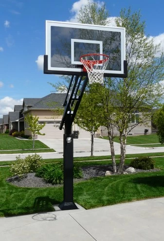 The Bison HangTime 6″ Adjustable Height Basketball System features a 36″ x 60″ Clear Glass Backboard with a heavy-duty outdoor breakaway goal and a bright white shooters square and border for professional level +performance right in your driveway! The square, heavy wall steel pole provides excellent stability and has a black powder-coated finish with padding for extra safety, and the pole was designed with a 48-inch safe play area to keep you safe when you go too quickly into your layup. Plus, the height of the rim can easily be adjusted using the right angle crank and spring assist mechanism, and an easy-to-read rim height indicator was included on the side to help you achieve your desired height. Adjustable height rim is great to use for players of all ages!