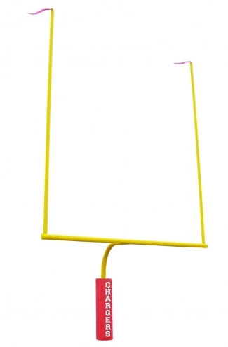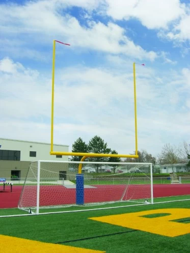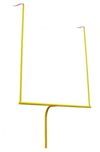 When you are looking for exceptional football goalposts with industry leading features and warranty, trust First Team’s All American line. The All American series boasts a massive 5 9/16″ diameter steel post for +structural stability unmatched by competitor’s lines. For rust free performance the goalpost has a galvanized undercoating while the 5 9/16″ diameter crossbar and 4″ diameter uprights are made from rust free aluminum. Don’t be fooled by small diameter weak, sagging crossbars and flimsy uprights offered on many competitors systems. First Team’s All American series has several installation features that make set up the easiest in the industry. First, the All American has a unique telescoping nosecone design that allows the overhang distance to be extended anywhere from 6′ 9″ to 8′ 6″. So no matter what, the crossbar comes out dead even with the back of the endzone every time. Second, the nosecone attachment not only allows the crossbar to be leveled at time of assembly, but you can also fine tune the crossbar elevation up to 2″ up or down. So the crossbar is always at perfect 10′ height every time. Third, each upright is attached to an adjustable corner elbow that is fully rotational allowing the uprights to be assembled perfectly straight every time. Remember, because the All American can be set to a maximum overhang of 8′ 6″ it works great when used in conjunction with portable soccer goals on multi-use fields. All American football goalposts are available with safety yellow powder coat finish. Wind direction streamers are included. All American football goalposts are covered by First Team’s 10-Year Limited Warranty.