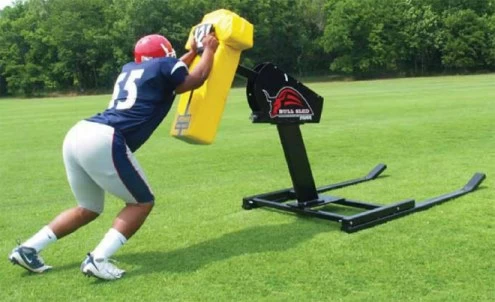 The Fisher Bull Rush One Man Blocking Football Sled – Pummel Pad teaches players, specially defensive linemen and linebackers, how to drive, extend, and react to blocks put on them by offensive linemen. +The unique forward slant blocking head allows players to drive into the sled coming out of their stance and focus on speed and quickness. The pad drives in 8″ and then releases upward, teaching players how to get off the block and react to the ball carrier. With the new pummel pad, players also learn to keep their hands inside, and aim for the breast plate.