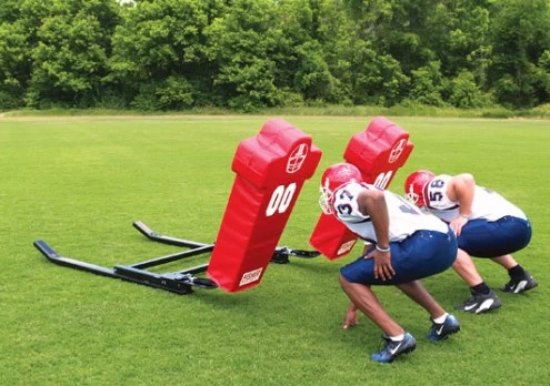 The Fisher 5 Man Brute Football Sled provides real life training for offensive linemen with flat leaf springs which deflect to absorb the shock and bounce back to provide the same effect as +player on player contact. Constructed of individual component stations which allow a 2 man sled to be upgraded to 3 or more men and a 5 man sled to be broken down to a 2 man and 3 man sled. Sled skids are formed, not cut and welded and feature a 30 degree angle for a smooth transition over grass or turf. Each high density, 100 lb impact resistant foam pad is triple stitched to withstand harsh weather and years of hard use. 5 different pad styles with 11 different vinyl cover colors available. 5 year manufacturer warranty and powder coated metal provides maximum weather resistance and confidence that this blocking sled will last through years of training. Recommended for high school ages and above.